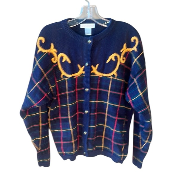 Sarah Alexander Vintage SzL Cotton Ramie Old Money Tartan Plaid Cardigan Sweater
