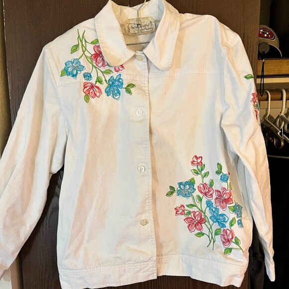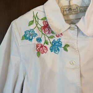 Sarah Bentley Embroidered Floral Shirt Jacket Women’s White Button Size M Vtg