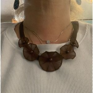 Sarah Cavender Mesh Metalworks Flower Necklace...5 flowers, largest in center, decreasing in size to end ones. Entire piece is metal. Weight approximately just over 1 ounce (30 grams. Signature tag attached at back. Adjustable. Largest center flower measures 1.75 inches diameter. End to end length 19 inches. Will go from 16 to 18 inches. Chocolate brown with hints of red. Excellent condition.