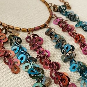 Sarah Cavender necklace and matching earrings set. Necklace measures approx. 32.5" in total length. Fringe falls about 3 1/8". Earrings are about 2 5/8" long. Expect normal signs of age and use.