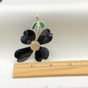 * Excellent condition with no chips or cracks, this lovely black enamel and gold tone dogwood flower brooch is a vintage 1969 piece signed "Sarah Cov."
