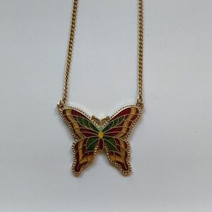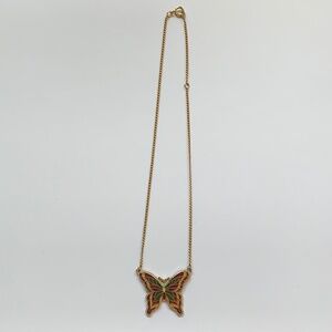 Add a touch of vintage elegance and fun to your outfit with this Sarah Coventry “Fly Away Choker” necklace from 1978. The necklace features a beautiful multicolor butterfly pendant on a gold-tone background and chain. The pendant hangs from a curb link chain with a spring ring closure. Necklace length is 14-16 inches. This necklace is signed "Sarah Cov" and boasts a unique design that is sure to catch the eye of any jewelry lover. Excellent condition. Colors may vary by screen. Ships in a recycled Dillard’s box.