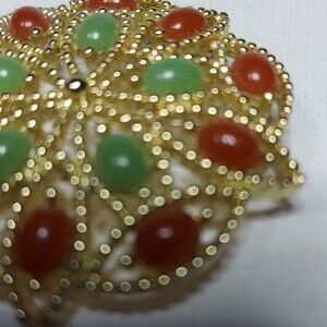 Sarah Coventry Acapulco Brooch Pin Green and Dark red on goldtone base