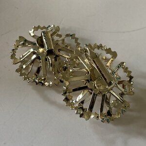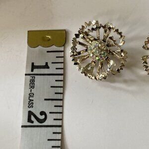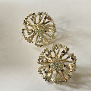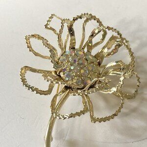Beautiful Vintage gold tone Sarah Coventry Aurora Borealis rhinestone flower brooch with matching earrings. This is a beautiful set sparkling iridescence multi color rainbow tones when moved in the light