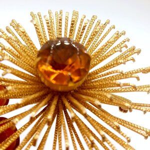 This exquisite vintage brooch features a stunning amber rhinestone set in a detailed starburst design. Crafted by Sarah Coventry, it's a refined accessory for those who appreciate timeless elegance. The intricate detailing and rich gold tone make it a standout piece in any collection.