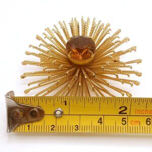 Sarah Coventry Brooch Gold Tone Metal Starburst Amber Rhinestone Center Vintage