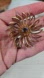Vintage 1960s circa Sarah Coventry Canada flower brooch. Flower resembles a sunflower or daisy. Brooch is goldtone metal with atomic style influence with a faceted AB rhinestone center with multiple small orange/yellow rhinestones surrounding.