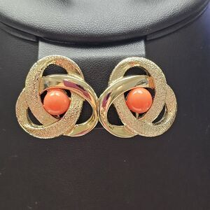 Sarah Coventry Clip On Earrings Orbit 1970 Faux Coral Cabochon Gold Tone