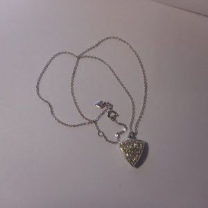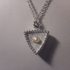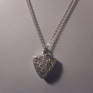 "Sarah Coventry silver tone Dawn to Dusk pendant necklace from the 1960s, can be worn at 16"" or 18"" long, very nice used condition, pretty reversible piece, faux peal on one side and rhinestones on the other side.