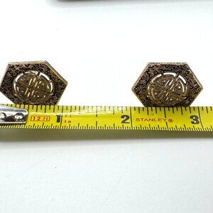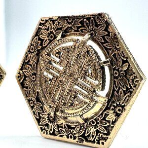 These vintage Sarah Coventry clip-on earrings from 1977 feature a gold-toned hexagonal floral design "Teahouse" inspired by Asian aesthetics.