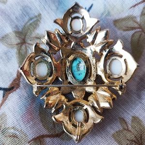 This listing is for an oversized signed Sarah Coventry brooch, but it looks remarkably like Florenza. It is set in a gold tone setting, with faux, mottled turquoise stones. There are also 4 faux pearls. It is completely free of tarnish and the clasp is in perfect working order. It measures approximately 3" tall by 2 3/4" across. I will include a velvet dust bag for storage. Buy with confidence, careful packaging promised. I love to bundle.