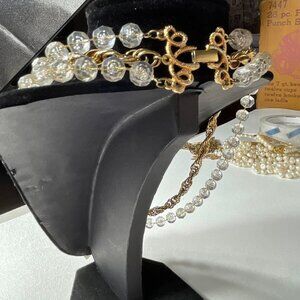 The two outer strands feature clear, faceted plastic (lucite) beads strung on a gold-tone cord or wire, which is visible through the beads and gives them an icy appearance.