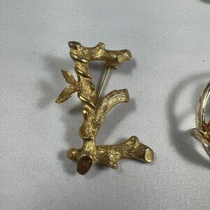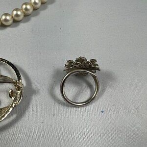 This versatile Sarah Coventry set combines elegance and vintage charm. Featuring two pearl necklaces, three detailed brooches, and a crystal-adorned ring, it's a timeless addition to any jewelry collection.