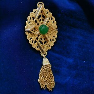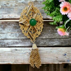 Sarah Coventry Peking Brooch Tassel Pin Filigree Gold Tone Green Glass Cabochon