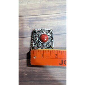 Sarah Coventry Red Cabochon Vintage Brooch Pendant Ornate Filigree Square Design