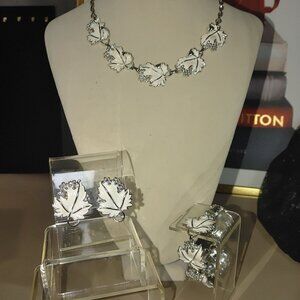 Sarah Coventry Set Whispering Leaves Parure Vintage White Silver Tone Enamel 4pc