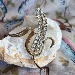 This listing is for a signed, Sarah Coventry, vintage brooch, in the shape of fresh, rhinestone corn. The roll over clasp is in perfect working order. The quality of the stones are very nice, considering the age of the brooch. It has a total of 24, 5mm rhinestones, all clear, none dead or discolored. It measures approximately 3 5/8" long. I will include a velvet dust bag for storage. Buy with confidence, careful packaging promised. I love to bundle.
