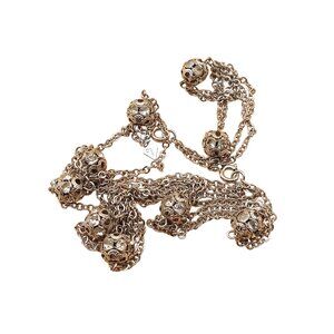 This vintage Sarah Coventry necklace features intricate filigree ball accents on a silver-tone chain, exuding timeless elegance and classic detailing.