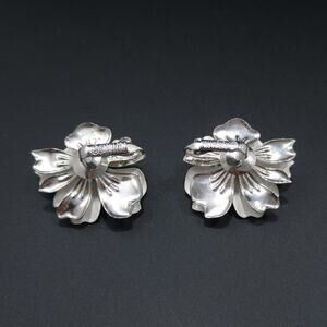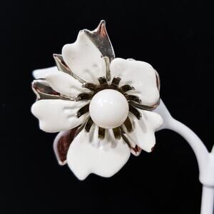 *Description: This is a pretty vintage pair of Sarah Coventry enamel & silver metal earrings from the 1960s. The earrings are clips with a white bead center. The bead is framed with silver. The middle layer is a white enamel petals with the bottom layer of silver metal. They would make a great pair of wedding earrings or add to any favorite outfit. They would also make a great gift.