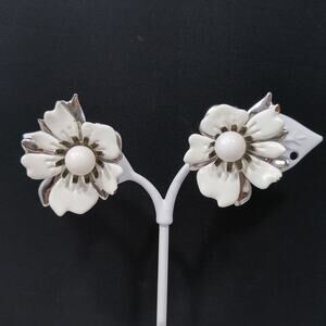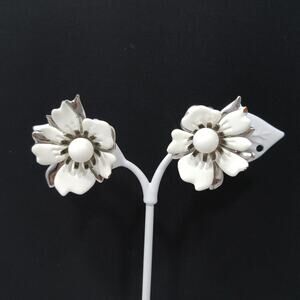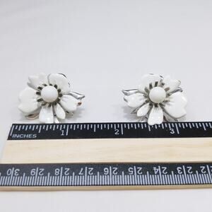 Sarah Coventry White Enamel Flower Earrings Silver Tone Clip On 1960s Vintage