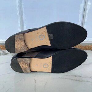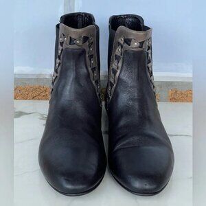 Retail $650 in good condition hand made color block. Black leather /taupe leather trim with side stretch panel. No box