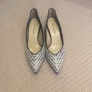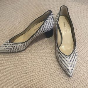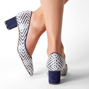 These are limited edition woven pumps from Sarah Flint with extra foot padding and a comfortable navy suede block heel