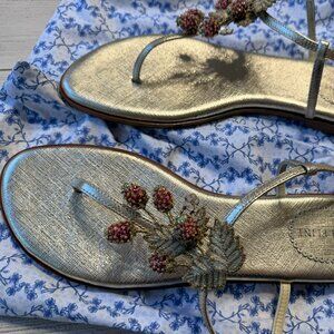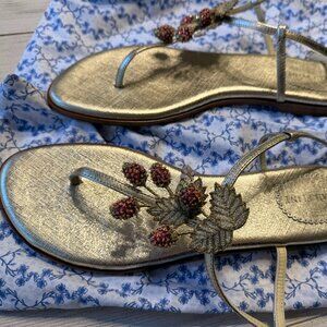 These are NEW (never worn) Sarah Flint Gold Textured Saffiano Sandals with hand-beaded raspberries and white flower details. This is the 'Allison'. The size is IT 41.5 (US 10.5). These sandals were only available by special order. They include the original Sarah Flint packaging (shoe covers for storage and golden box).
