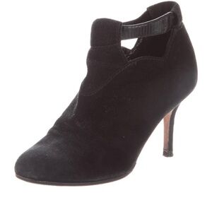 Sarah Flint suede booties with cutouts. Stiletto heels 3.25”. Rounded toe size 6.5.