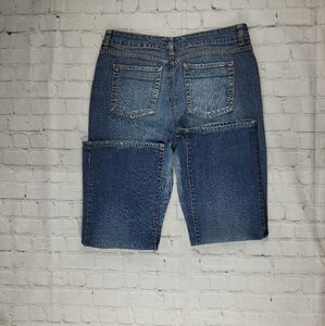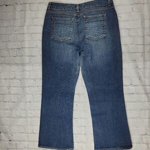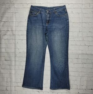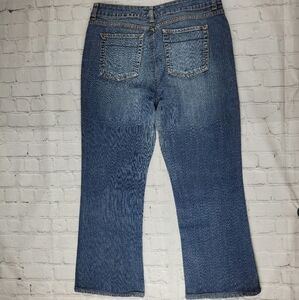 Bitten by Sarah Jessica Parker, flared leg, 5 pocket, medium wash, button/zip closure, mid rise waist, 30" waist, 10.25" rise, 26" inseam, cotton/spandex blend, boho, previously owned, good condition, size 14S