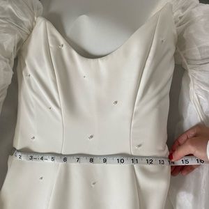 please let me know if there are any areas in particular you would like me to measure. keep in mind that crepe stretches and is very flattering. So you want it to fit a bit snug especially since it is strapless. it is extremely comfortable. sarah seven is amazing