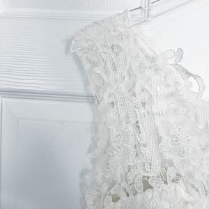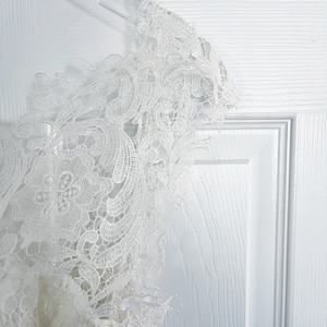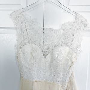 White Lace overlay bodice with illusion sweetheart neckline. Ivory box pleated silk skirt. Internal bustier and cups. Mostly lined.