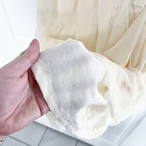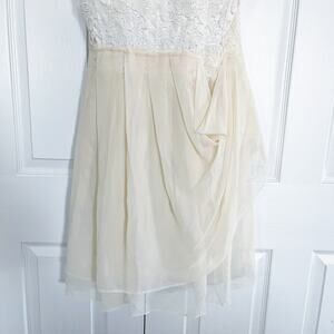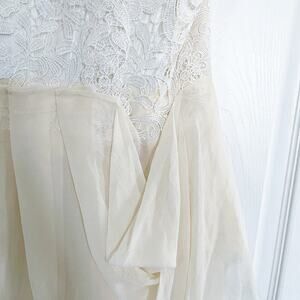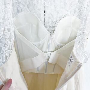 White Lace overlay bodice with illusion sweetheart neckline. Ivory box pleated silk skirt. Internal bustier and cups. Mostly lined.