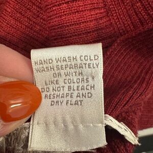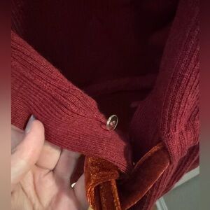 arah Spencer Burnt Red Merino Wool Cardigan w/ Velvet Tie Waist ~ darling! Perfect for the holiday season. This is a beautiful ribbed cardigan. Long sleeves. Straight bottom hem line. Beautiful seam details at the shoulder. Beautiful velvet tie at the waist that is adjustable. 100% merino wool
