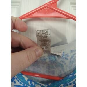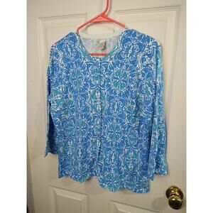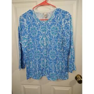 Sarah Spencer woman XL cardigan front square button close in good condition. Aqua blue white artsy tight knit