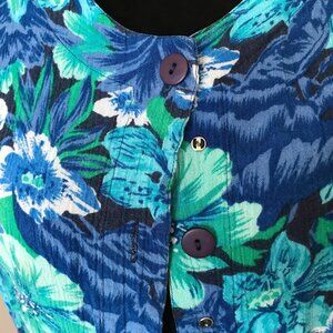 Vintage flowery crepe tunic, women's size medium. This is a beautiful floral print blouse in blues and greens with dual button and snap front closure, shoulder pads, and short sleeves. In very good vintage condition, this blouse would make a pretty, colorful addition to your wardrobe!
