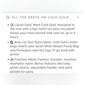 NWT Sarah Wells Cold Gold breastmilk cooler and Swag bag, and NWOT Pumparoo foldable wet bag and staging mat in the "color this bag" design. Comes with brand new Ooly fabric markers for you to customize your bags to make them truly yours! The last photo is just showing an example of what you can do from another bag.