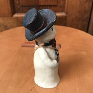 Sarah's Attic Old Glory Snowman; Holds Single Star American Flag; Wears a Black Top Hat, Dark Red Bowtie w/Small White Heart; Heart Hang Tag on Twine; Bottom Stamped Sarah's Attic "Granny's Favorites" Made in USA enclosed in a Heart' and Limited Edition #47/4000; Back Stamped Old Glory SA 1989; 4.5" Tall & 2.5" Wide