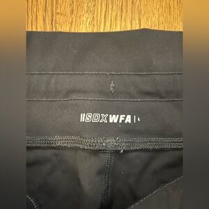 These leggings are super soft with an elasticated tie waist so they stay on during workouts. There is some minor wear on the color stripes near the calf (see photo) but other than that they are in good condition.