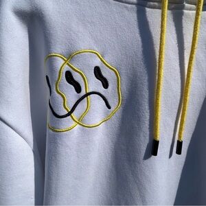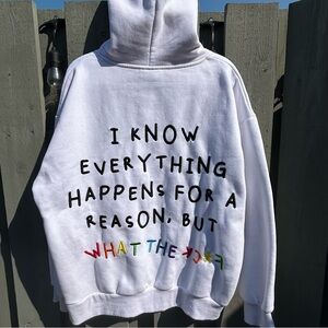 Contemporary White hoodie sweatshirt with embroidered smile and frown faces on front right chest. Back features bold black embroidered text and colorful letters at the bottom reading “Everything happens for a reason, but what the KC*F”.
