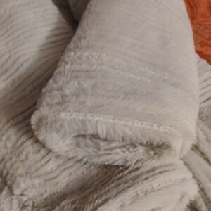 Cozy gray jacket with hood. Button-up front. Soft and warm material.