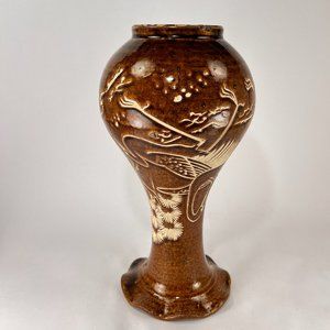 Sarawak Vase Clay Pottery Carved Crane Bird Glazed Brown Cream Ruffle Folk Art