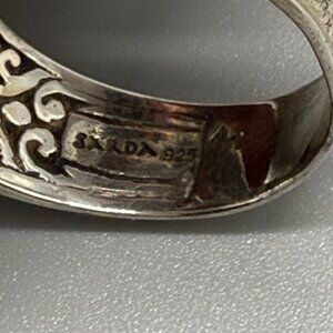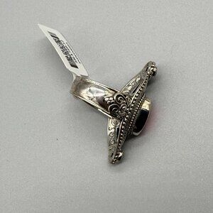 This handcrafted sterling silver ring features a central rainbow red mystic quartz triplet, flanked by intricate detailing, offering an elegant statement piece.