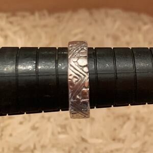 Sterling silver decorative band by Sarda. Combination of hammered, dots, lines and more. Measures 1/4 inches wide. Marked Sarda and 925. Size 6.75.