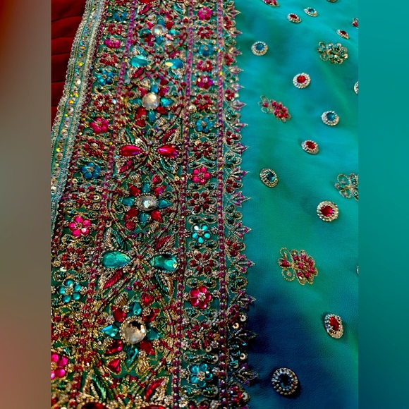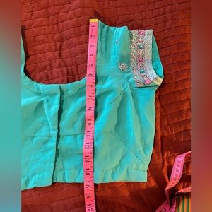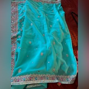 Reposh! Purchased brand new saree as an alternate for a South Indian wedding but never actually wore it. Beautiful teal/aqua blue color with intricate rhinestone and sequin detailing of and a blouse and border of saree. Blouse closes at the back with hook and eye and does not include cups but can be added. Does not include a petticoat and since the fabric it is opaque, any will work with this beautiful piece. Sold as a set but would also work very well with silver or magenta blouse. Very glamorous on and fantastic for any formal Indian event!
