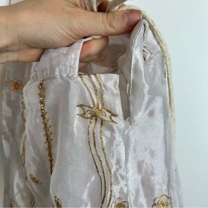 sheer shimmery material with pink and gold embroidery details