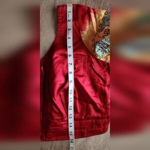 Red and gold like a sunset saree or sari with beautiful elephant applique embroidery and sequins. There is no size, so photos with measurements are provided for the top, and the saree measures 214 inches. it is in excellent condition. The top has a V-neck on front and back and elephant applique on the short sleeves. There are no stains, no rips, no snags, and no pilling. Material is unknown.