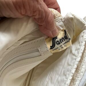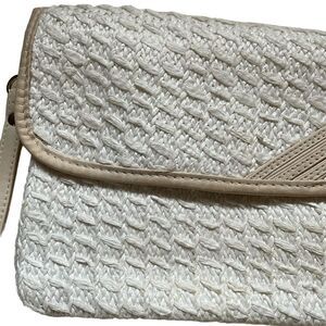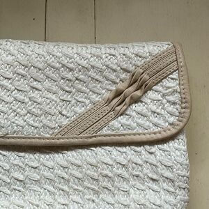 Sarne Vintage 1960's White Clutch Purse Woven Raffia Tan Leather Trim. Good used condition. A couple of small spots on the inside and on the leather handle.