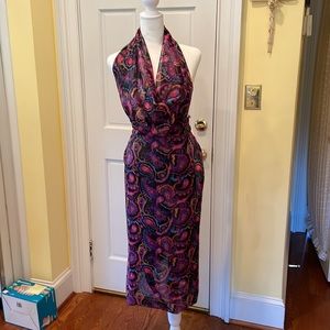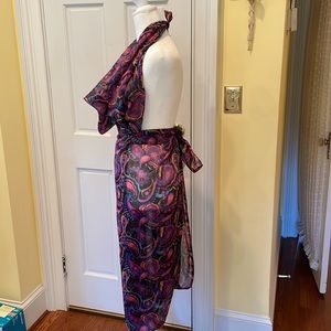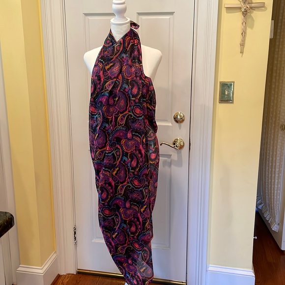 Multicolor, paisley, sarong, great cover-up for your swimsuit. Predominant colors are hot, pink turquoise, purple and black. Probably sheer polyester/nylon.