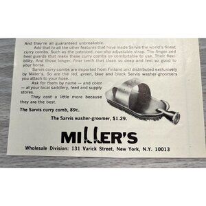 Sarvis Curry Comb Vintage Print Ad 1970s Horse Grooming Millers Wholesale NY