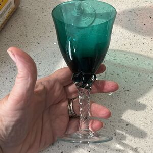 Set of six vibrant crystal wine glasses. Elegant twisted stems. Perfect for entertaining.